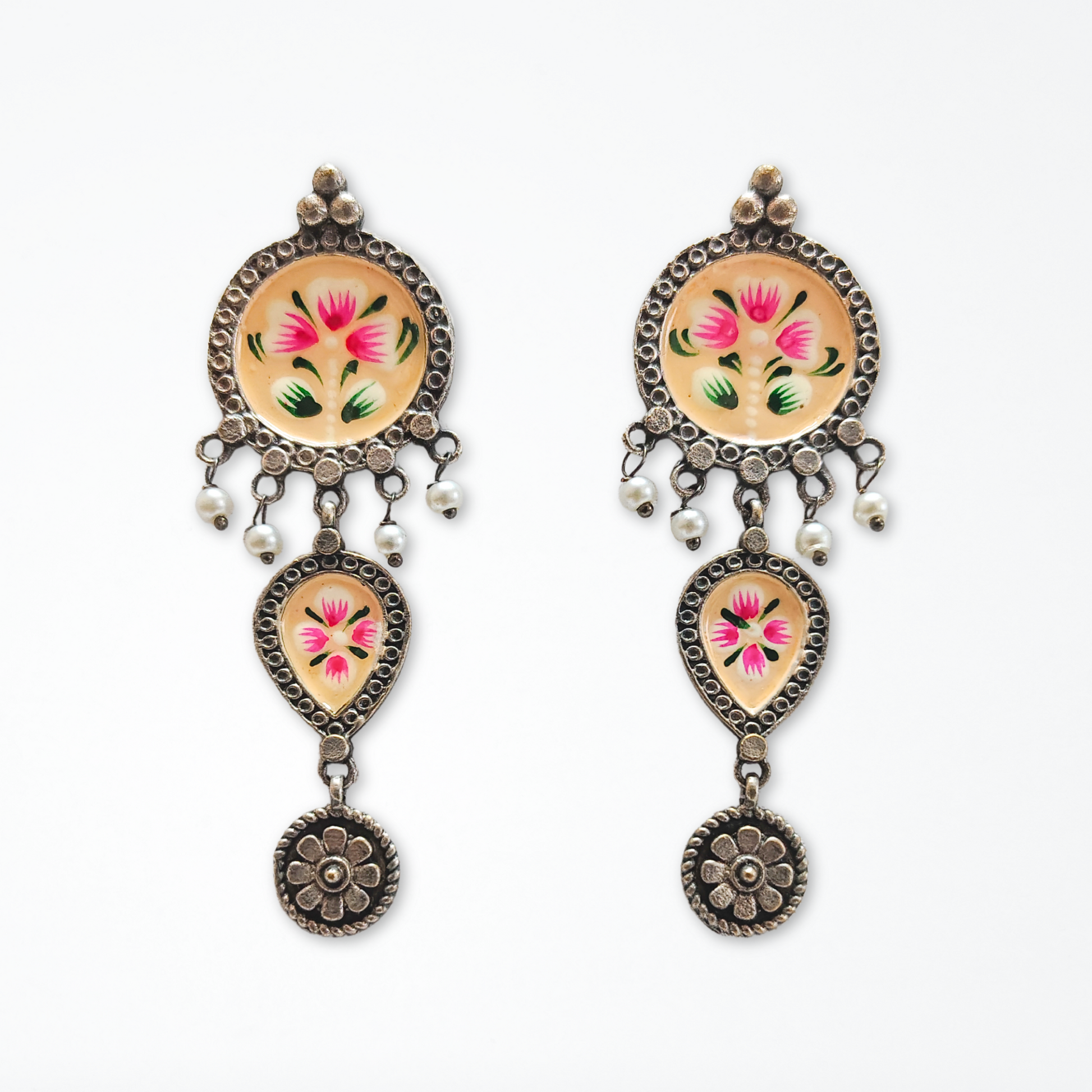 The earring features two tiers of floral motifs meticulously hand painted on yellow background with a patterned rim. The earring is enhanced with delicate pearls. Crafted to celebrate and preserve the heritage of Rajasthani miniature art, it is a timeless earring that adds a touch of cultural richness to any ensemble.